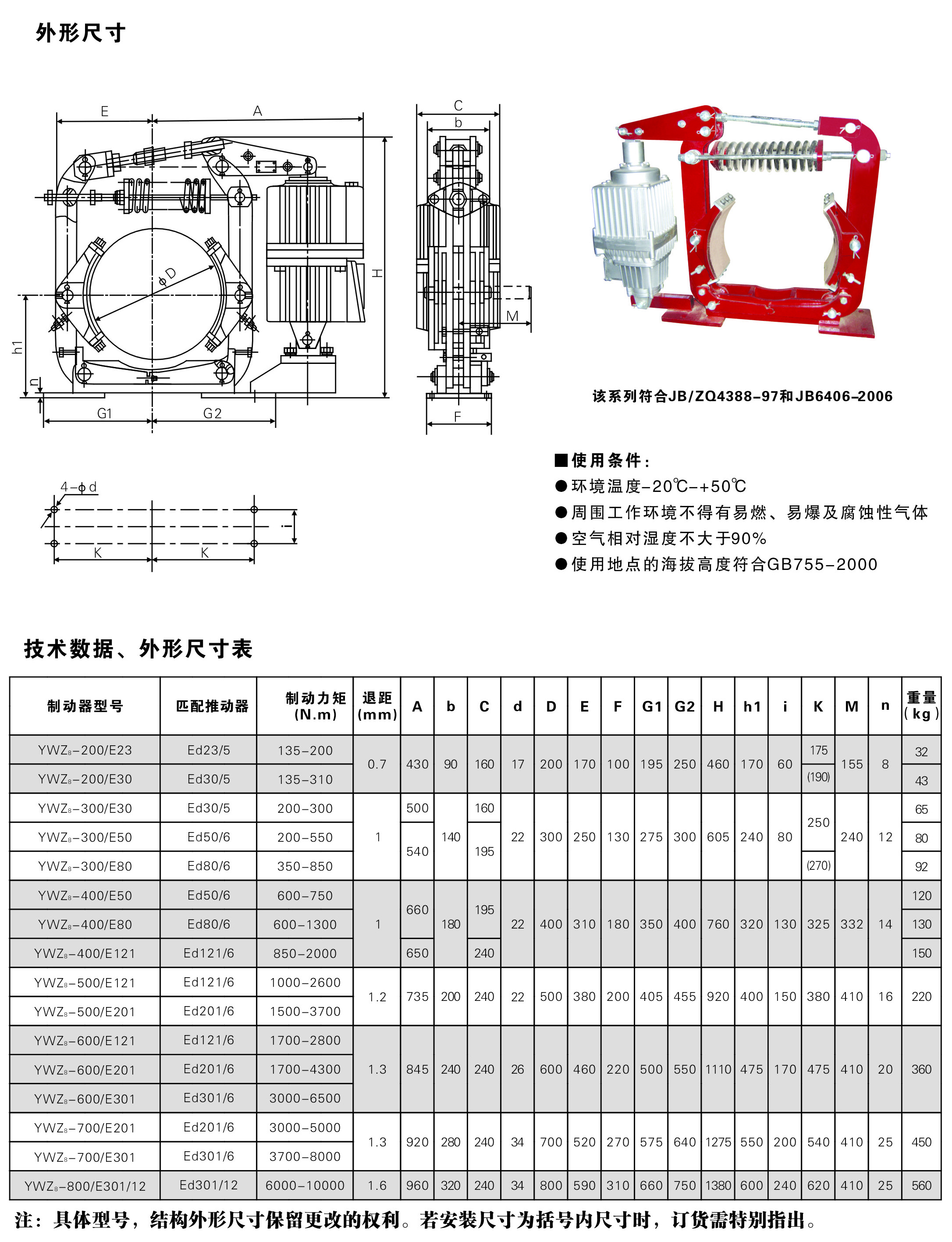 制動器安裝尺寸和制動力矩參數(shù):JH/ZQ4388-97標準,技術(shù)要求符合JB/T6406-2006標準。