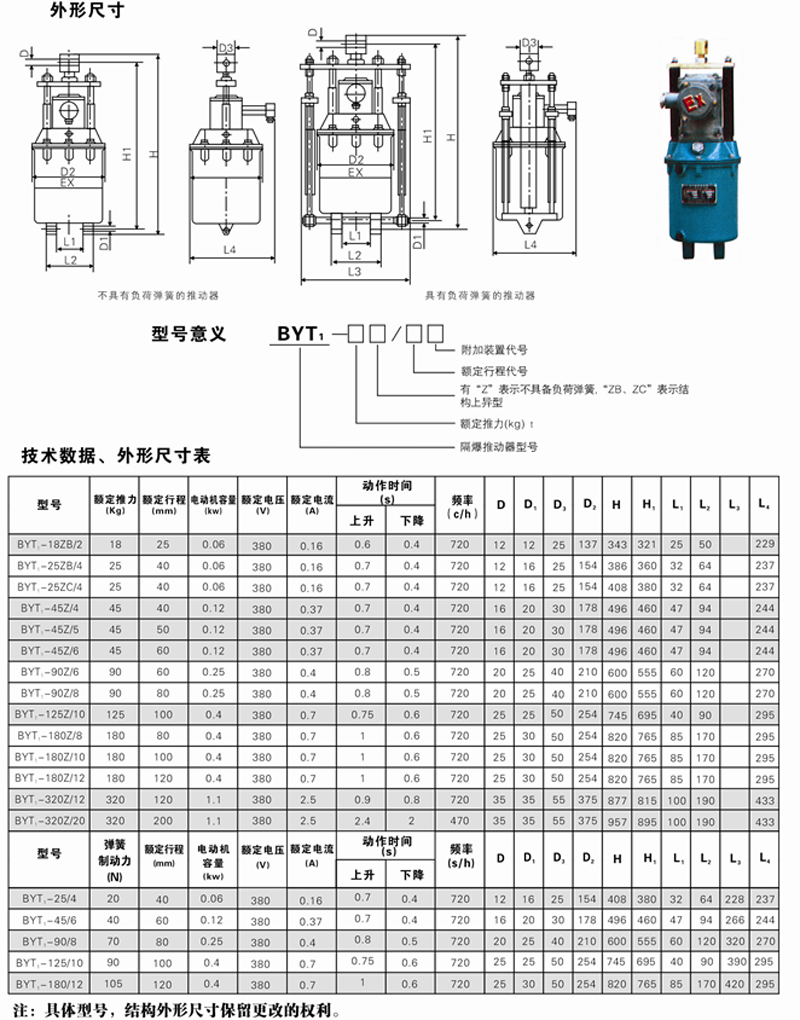 BYT1推動(dòng)器' >電力液壓推動(dòng)器隔爆型主要用于YWZ系列操動(dòng)閘瓦式制動(dòng)器,作為起重、運(yùn)輸、行車等一切類似驅(qū)動(dòng)裝置的機(jī)械制動(dòng)用。