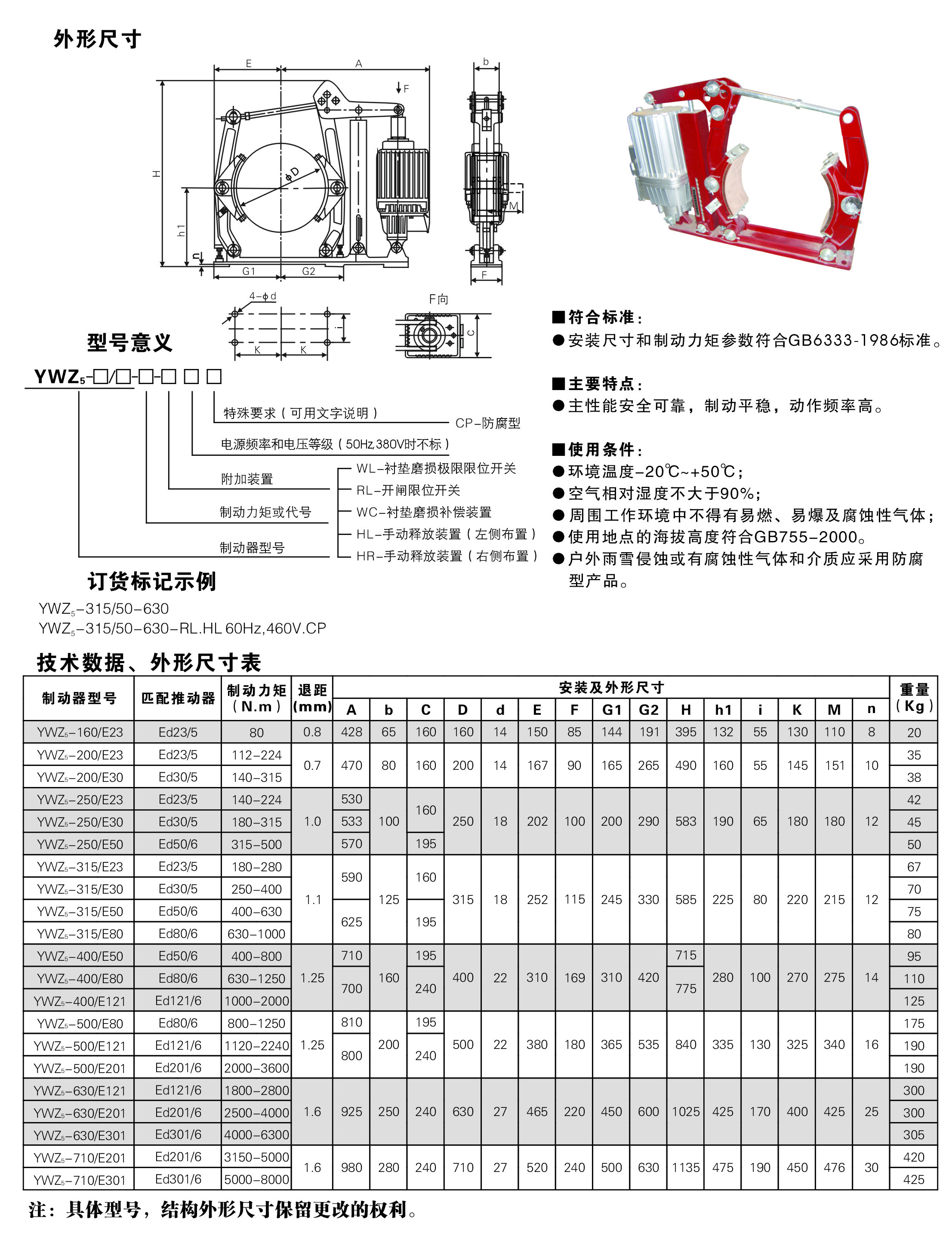制動(dòng)器安裝尺寸和制動(dòng)力矩參數(shù):GB6333-86標(biāo)準(zhǔn),技術(shù)要求符合JB/T6406-2006標(biāo)準(zhǔn)。